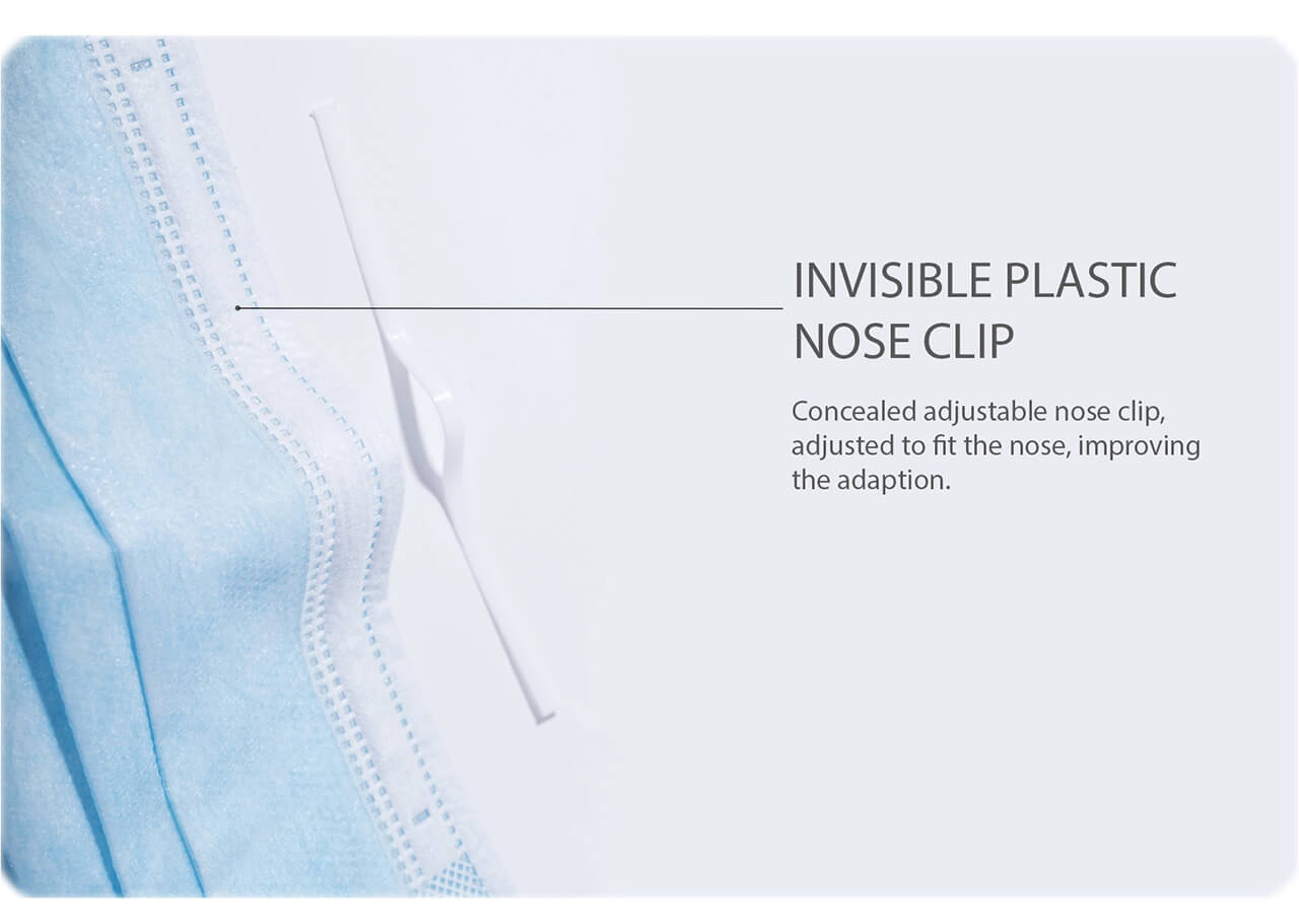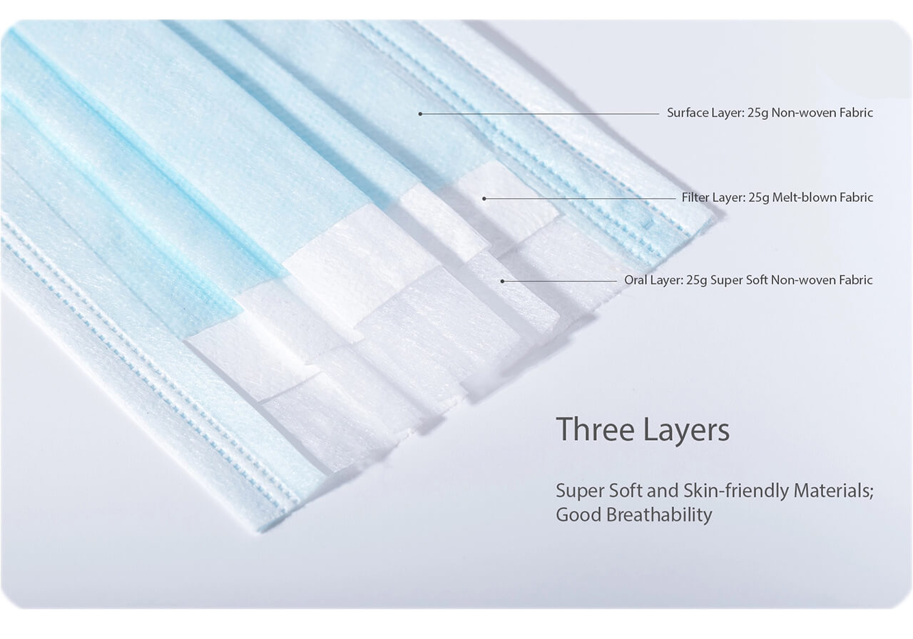 Le produit est principalement composé de tissu non tissé multicouche : la couche externe et la couche orale sont un tissu non tissé filé en PP, et le milieu est un tissu non tissé soufflé par fusion à haute performance de filtration. La couche externe est disponible en bleu, vert, blanc, noir et autres couleurs ; Les sangles d'oreilles sont larges et douces. La bande du pont nasal est faite de matières plastiques et s'adapte au pont nasal.
